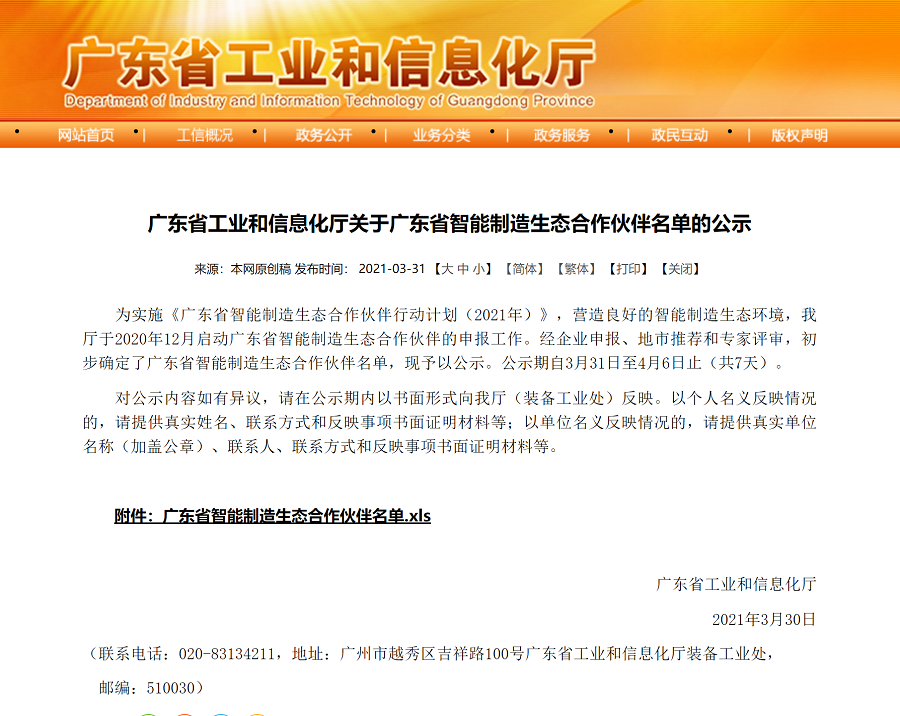 2021年4月,接點智能繼2017年廣東省第一批工業互聯網資源池企業、2018-2020年廣東省上云上平臺服務商、2020年重慶市工業互聯網和智能制造服務商資源池企業,再一次成為廣東省第一批智能制造生態合作伙伴。