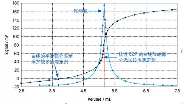 以往來(lái)看,大多數(shù)精確的滴定測(cè)試原理為等當(dāng)點(diǎn)(EQP)滴定。逐漸添加滴定劑的同時(shí),根據(jù)電勢(shì)和體積來(lái)繪制滴定曲線,并繪制出一階導(dǎo)數(shù)曲線。通過(guò)算法確定出一階導(dǎo)數(shù)曲線的最大峰值,該點(diǎn)即是滴定和樣品反應(yīng)完全的等當(dāng)點(diǎn),如圖1: